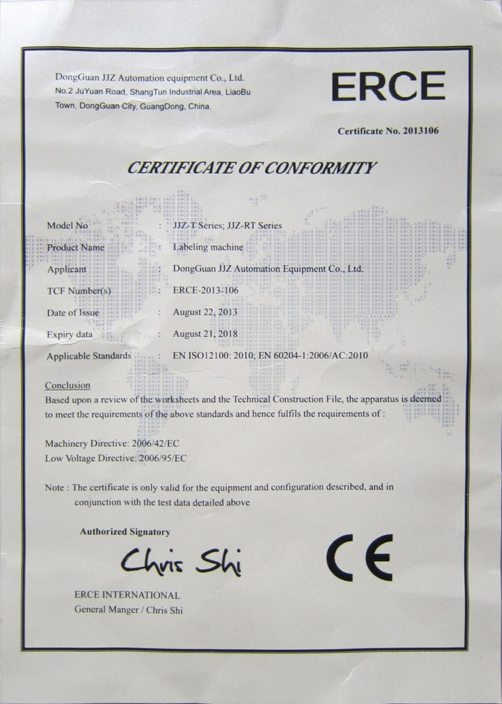 為使公司產(chǎn)品盡快進(jìn)軍歐洲市場,擴(kuò)大出口業(yè)務(wù),并提升我司對國際市場產(chǎn)品質(zhì)量的要求。通過努力,高臻智能公司旗下不干膠貼標(biāo)機(jī)及熱熔膠貼標(biāo)機(jī)系列產(chǎn)品已于2013年8月順利通過了CE認(rèn)證。獲得得了認(rèn)證產(chǎn)品的CE認(rèn)證《符合性證書》及相關(guān)測試報告。為公司主導(dǎo)產(chǎn)品全面開拓歐洲市場提供了可靠的保障。