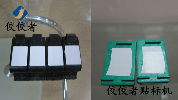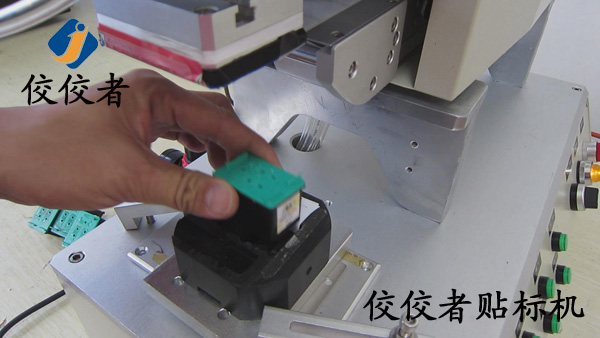 如圖展示的是工作人員將需要貼標(biāo)的小墨盒放在治具(固定產(chǎn)品用的模具,可根據(jù)產(chǎn)品的不同形狀定做).