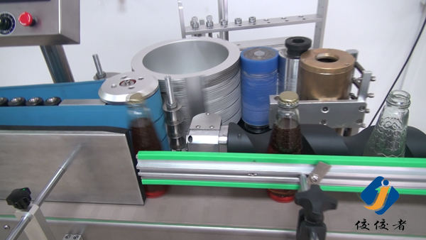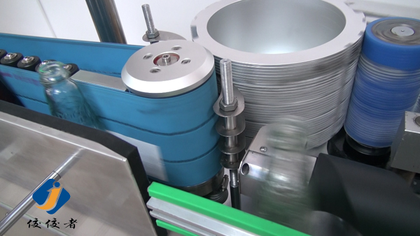 看到上圖中玻璃瓶子后面有一條螺旋狀黑色柱體了嗎?那個圓柱體就把瓶子們的間距調(diào)節(jié)得與出標(biāo)頻率吻合,瓶子們被一個個送到下圖這個傳送帶上進行貼標(biāo),傳送帶會準(zhǔn)確地把已經(jīng)糊好漿糊的標(biāo)簽給貼上瓶子,如下圖: