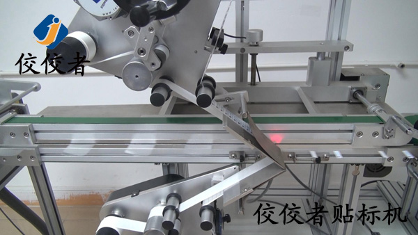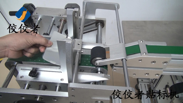 上圖展示的是工作人員將手機保護膜放在調(diào)整好寬窄的放料槽中,可一次放置多張,以不超過擋料板為限,此時有一個步驟在圖片中沒有展示出來,那就是接通電源之后工作人員要調(diào)整好貼標(biāo)頭的高低和前后位置,還有在人機界面上設(shè)定好相關(guān)參數(shù),這就是全自動貼標(biāo)機的方便之處,設(shè)定好參數(shù)后,開動該貼標(biāo)簽機,分料機械將手機保護膜一張一張分離出來,貼標(biāo)頭處檢測電眼檢測到產(chǎn)品對產(chǎn)進行上下面同時貼標(biāo),貼標(biāo)完成的產(chǎn)品由后面的輸送帶上進行收集?此浦挥泻芏虝r間,在這個時間中,機器進行了一系列的工作,貼標(biāo)頭處檢測電眼檢測到產(chǎn)品,將信號傳給貼標(biāo)頭步進電機,電機工作將標(biāo)簽剝出,同時貼標(biāo)頭的測標(biāo)電眼檢測到下一張標(biāo)簽,給信號貼標(biāo)頭步時電機,步進電機停止工作,這樣完成檢測一個產(chǎn)品出一張標(biāo)簽并貼在產(chǎn)品上。(貼標(biāo)過程:自動分出產(chǎn)在—>自動檢測貼標(biāo)并覆標(biāo)—>自動收集已貼標(biāo)產(chǎn)品。)如下圖: