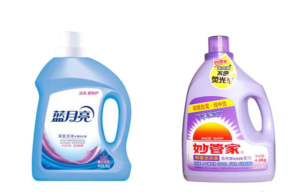 左邊的洗衣液瓶就是只貼單面的。右邊的那個洗衣液瓶要貼三張不干膠標(biāo)簽。雙側(cè)面要貼,而且還要在頸部部一張。這個有點(diǎn)難度,但是可以貼,用非標(biāo)準(zhǔn)機(jī)就可以加工了。